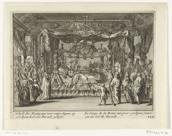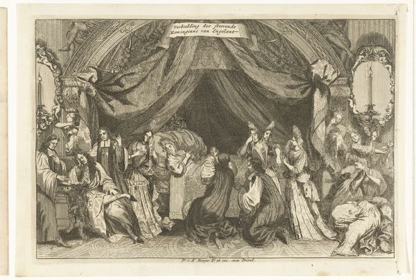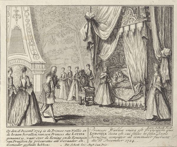 Curator: Let's delve into this fascinating engraving, “Maria Lesczinska in het kraambed,” crafted by Leonard Schenk around 1727 and held here at the Rijksmuseum. It depicts the Queen of France, Maria Lesczinska, in childbed. Editor: My initial impression is one of quiet, formal drama. The stark contrast and meticulous detail create an almost clinical observation of a very personal moment. I am drawn to the sharp details; they carry my attention directly to key focal points, but not without considerable mood-building within the space created with lines and depth. Curator: Indeed. As a genre scene intertwined with historical documentation, the composition meticulously balances realism with the ideals of Baroque artistry. Note the clear division between the intimate space surrounding the Queen and the courtly figures positioned towards the right— a physical manifestation of the social dynamics at play. Editor: The strategic distribution of light and shadow, so expertly applied to each contour, draws your eye and creates volume where little exists. Take, for instance, how line variations across the Queen’s face communicate pain versus fatigue, offering multiple perspectives in this scene that also carries themes of power and royal obligation. The texture almost makes you think the figures will step right out of their world into the real. Curator: Precisely. Schenk, likely working from an earlier painting or design, had the role of not only artist but also reporter, conveying an event of political significance to a wider public through print culture. It's important to view this work within the context of the early 18th century when printmaking served as both a disseminator of information and an influencer of public sentiment. Editor: It certainly illustrates how aesthetic conventions could subtly reinforce social structures, don't you think? I keep looking at this and appreciating how art allows us to experience the emotional weight carried in line and form, especially knowing that each cross-hatched segment also contributed to a network that bound a society to certain cultural perspectives. Curator: That's very astute. When viewed in this light, it presents a window onto the period, inviting us to engage with its artistic conventions and ponder their impact on our interpretations. Editor: It makes you wonder how much intention lies beneath each stroke of the burin. A truly worthwhile piece for contemplation.