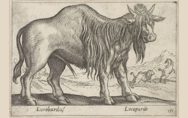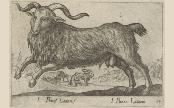 Curator: Immediately striking. I see the Baroque penchant for detail and texture, even in this modestly sized print. Editor: We're standing before "Libische geit", or "Libyan Goat", an engraving by Antonio Tempesta, dating from before 1650, now held here at the Rijksmuseum. Its rendering of this particular animal is quite… unique. Curator: The rendering *is* fascinating. Look at the texture of that shaggy coat – almost like flowing water, a river of hair. Is it intended to represent abundance, fertility perhaps, with the exaggerated udder? Editor: That's certainly one layer. Consider, though, the burgeoning field of natural history during this period. Thinkers were striving to categorize and understand the natural world. Perhaps Tempesta sought to create a scientifically accurate depiction. The text on the print labels this goat *Capra Libyca*. Curator: True, there's that objective element of documentation, of typological study. But the dramatic, almost theatrical lighting can’t be ignored, elevating the humble goat. The smaller goat in the background too; it reminds me of a family portrait, a dynasty perhaps, set against this backdrop. What is your view? Editor: I'm curious about the function of such an image. Prints circulated widely, making art accessible. Did this image adorn the walls of wealthy collectors, a display of their refined tastes? Or was it disseminated amongst a broader audience, sparking curiosity about exotic animals and faraway lands? We can never know for certain the context from a contemporary view. Curator: The ripple effect is immeasurable – art constantly changes meaning as cultural and socio-economic spheres develop, the context always influencing how art is presented and received. I wonder what these animal images signified to 17th-century minds in their time as society was going through the discovery age? Editor: It's a question of the ever-evolving dialogue between art, the public, and historical forces. A reminder that art isn't created in a vacuum. Curator: Precisely. "Libische geit," it is an example of a humble artwork encapsulating so much about a time through symbolic value, culture and knowledge. Editor: It provides insight to art history, while making it interesting in approach and discussion.