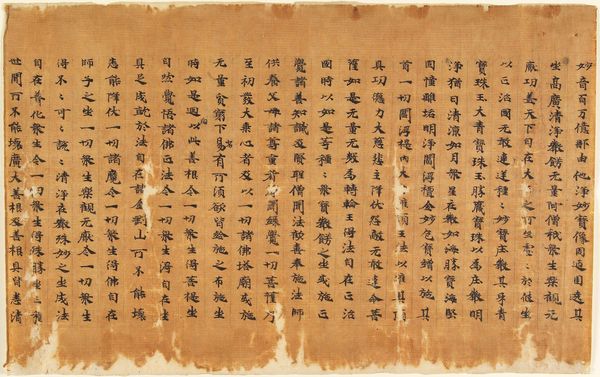 Curator: Here we have a page from a Kalpa Sutra, a Jain book of rituals, dating back to the 15th century. It's currently housed at the Metropolitan Museum of Art. What grabs you first about this leaf? Editor: Well, initially it feels quite dense. It’s obviously text, meticulously rendered, with these vibrant, almost jarring, red circles punctuating the script. What do you see in this piece? Curator: You know, 'dense' is a wonderful observation. To me, that density speaks to the devotion poured into its creation. The script isn’t merely functional; it’s art, each stroke imbued with intention. The red circles… yes, jarring, yet anchoring. They act like breaths in a long, complex chant. Editor: A chant! That makes sense. So, the visual is also kind of like a mantra? Curator: Precisely! Think about the visual rhythm. The black ink against the aged paper, the deliberate placement of the vermillion circles... and the evenness with the red guidelines running at top and bottom.. Does the text look haphazard? What words do you make out? Editor: Definitely not haphazard! There’s an incredible order to it, even if I can’t read the script, I notice an evenness to the text in lines. I wish I could read the specific mantras or messages. Curator: What might seem obscure to our eyes was incredibly significant in its time, revealing complex theological concepts through text and form. I like to imagine this in the hands of a Jain monk, the light catching the red pigment. Editor: It’s funny, now I’m picturing that monk too. It was that personal. It does feel a lot less dense and more intimate somehow now. Curator: Isn't it incredible how a shift in perspective can breathe new life into art? Always keep those questions alive, my friend. Always be curious!