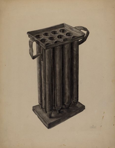 Curator: Looking at this rather austere drawing of a Candle Mold, created circa 1940 using pencil, one can't help but consider its simplicity. Editor: It strikes me as industrial, almost brutalist, even in its rendering. A study of function, devoid of overt sentiment. It feels very... grounded. Curator: I find it more contemplative. The mold itself—an everyday tool—becomes an object of meditation. Candles are powerful signifiers of light, hope, guidance through darkness, which we now take for granted given electric lighting. This image makes me consider their preciousness during this time. Editor: Yes, but preciousness comes at a price. Who had access to this kind of light? What did the burning of candles obscure—the exploitation of labor, environmental degradation? What appears quaint now was likely imbued with inequity. Curator: True, yet domestic craft itself has been devalued. Think of all the symbolic rituals tied to candle-making, the communal activity, now largely lost as we've moved to factory production. Editor: Agreed, this object prompts us to question notions of progress and modernity. The "efficiency" of mass production also extracts cultural significance. Consider the gendered dimensions of the art and labor, often assigned to women... invisible work, quite literally overshadowed. Curator: Exactly! And what is it about the artist's decision to focus on such an object during that specific period, as industry accelerated, and wars consumed nations? Perhaps, in a search for symbols of resistance, finding power in domestic spaces. Editor: Maybe we must also see it as resistance to mass-commodification of rituals that connect us—making us more human. Thank you for opening the door. Curator: And to you, for connecting those histories so critically. This artwork offers endless depths.