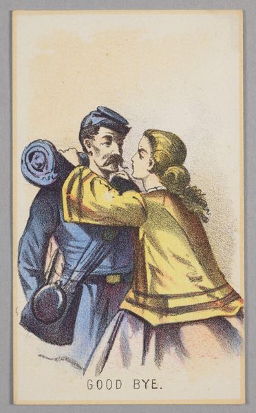 Winslow Homer made this small print, "Life in Camp, Part 2: Good Bye," using wood engraving, a relief printmaking technique, around the time of the American Civil War. The image’s power lies in its simplicity and directness. With minimal lines, Homer captures a poignant moment of farewell, emphasizing the human cost of conflict. The texture of the wood is integral to the artwork’s overall effect, imbuing it with a sense of rustic authenticity. The linear quality of the engraving, and the small scale suggests the mass production of images in the 19th century. Prints like this were widely circulated, reflecting and shaping public sentiment during the Civil War. Homer worked as an artist-correspondent embedded with the Union Army. His decision to employ wood engraving speaks to the increasing democratization of image-making, and the ways that inexpensive prints could both inform and mobilize a broad audience. This challenges the traditional hierarchy between fine art and printmaking, highlighting the power of accessible imagery.