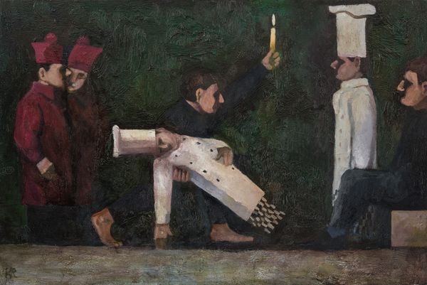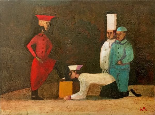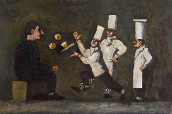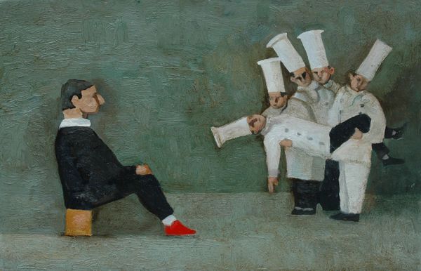 William Balthazar Rose created this oil on canvas titled "Free for All!" sometime after his birth in 1961. The painting depicts a chaotic scene with figures dressed as chefs engaged in a brawl while others look on. This image of chefs fighting over food sparks questions about societal class structures. Are the chefs fighting for their own survival, or is this some kind of game? The cupcake hovering above the scene adds an element of dark humor, a commentary on the triviality of conflict amidst the serious and universal need for sustenance. Rose's choice to depict chefs also opens up a dialogue around labor, gender and identity. Traditionally, the culinary world has been male-dominated, and this painting might be seen as an interrogation of that power dynamic. The emotional depth of this painting lies in its ability to tap into our collective anxieties about survival, competition, and the absurdities of the human condition.