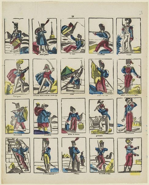 This print, "Wat gij verlangt van dit of dat, / Dee'z prent vertoont van alles wat," created by Lutkie & Cranenburg, presents a series of vignettes rendered with delicate lines and soft coloring. The eye is drawn across the surface of the paper with sequential movement that mimics reading. Notice the grid-like arrangement of the scenes, each acting as a window into a moment of daily life. The scenes are framed by thin, dark lines, creating a semiotic structure not unlike panels in a comic strip. This rigid framework contrasts with the loose, almost playful rendering of the figures within. The limited color palette—primarily blues, reds, and yellows—creates a sense of harmony and continuity, yet each scene maintains its own distinct narrative. Consider how this structured yet whimsical approach challenges fixed meanings. The print invites viewers to question the values, expectations, and categories that define our world. It encourages active participation, urging us to find our own meanings and make connections.