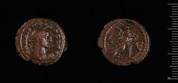 Curator: Here we have a Tetradrachm of Alexandria under Diocletian, residing here at the Harvard Art Museums. Editor: Its patinated surface and worn details speak volumes of its journey through history, evoking a sense of antiquity and survival. Curator: Absolutely. Diocletian, the ruler, reshaped the Roman Empire's structure, notably through the Tetrarchy. This coin embodies his efforts to legitimize and disseminate his image throughout his domain. Editor: And the material itself—likely bronze or copper—highlights the empire’s reliance on these resources for both commerce and control. The repetitive striking of these coins was, in essence, a form of mass production. Curator: Indeed. This coin serves as a tiny yet potent symbol, weaving together narratives of power, identity, and the social structures of the time. The portrait on one side, the imagery on the other – they were carefully chosen to communicate specific messages to the populace. Editor: Seeing it in this aged state prompts questions about its circulation, its value, and the hands it passed through. It is a potent relic from the past. Curator: It invites a deeper consideration of the legacies of empire. Editor: Agreed, what an interesting lens into the past.