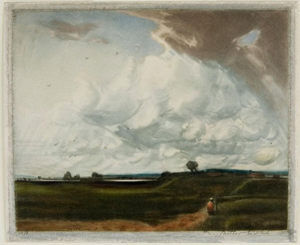 Editor: John Steuart Curry's "The Cloud," painted around 1930, uses oil on canvas to depict a sweeping landscape. It’s really striking how the cloud dominates the scene. What visual cues jump out at you in this painting? Curator: That cloud, pregnant with promise or threat, is far from innocent. Consider the historical context – the Dust Bowl era. The land is barren, the colors muted, and those cattle seem small, vulnerable, almost symbolic sacrifices. How does this image resonate with cultural anxieties surrounding land and sustenance? Editor: That's fascinating. The Dust Bowl context definitely shifts my perception. It feels much more charged now, less a peaceful landscape and more of an ominous premonition. What is it about clouds as symbols in American art? Curator: Clouds in art often represent the sublime, the uncontrollable forces of nature. Here, the cloud becomes a potent symbol for both hope—the potential for rain, renewal—and fear—the impending storm, devastation. Think about how landscape painting shifted in American art after the Civil War, especially following westward expansion, grappling with land ownership, identity, and the consequences of our actions. Can you sense any echoes here? Editor: I see it now. It is about that constant negotiation between humanity and nature, a push and pull between promise and threat. The cattle underscore the vulnerability of our place in it. Curator: Precisely. And notice how the horizon line divides the painting almost perfectly, drawing our eyes to the impending weather. Curry doesn't simply paint a landscape; he crafts a stage for a cultural drama. Editor: I'll never look at a landscape painting the same way again. There are so many cultural narratives embedded in this artwork. Thank you! Curator: The symbols speak when you know how to listen. Keep seeking them in art, they are all around.