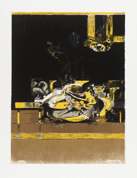 Joe Goode’s painting, "Birthdays," presents an intriguing visual experience with its stark contrast of dark and light tones against the tile grid. The composition relies heavily on the interplay between the bold, gestural sweeps of impasto paint in shades of peach and navy blue, which creates a dynamic tension. We might consider this as a reflection of semiotic theory where each colour becomes a signifier, the black background can be seen as absence or a void, while the vibrant colours stand for presence and expression. The artist teases our understanding of space and form, with the grid structure of the tiles working against the fluidity of the painted gestures and in doing so challenges fixed meanings of abstract expressionism. Notice how Goode employs a simple but powerful juxtaposition. The smoothness of the tile clashes with the coarse texture of the paint and in this disruption, Goode prompts a re-evaluation of established artistic conventions, inviting viewers to engage with the piece not just aesthetically, but also intellectually.