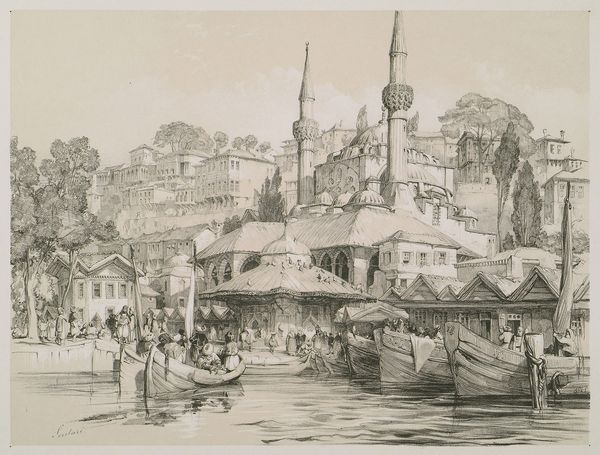 Editor: This is Ibrahim Calli's painting, "Uskudar," an oil on canvas rendering of a bustling waterside city. The palette feels muted, dreamlike. It’s a captivating blend of architecture and human activity, but what strikes me most is how… nostalgic it feels, even though I’ve never been there. What do you see in this piece? Curator: Beyond the depiction of Uskudar, a historic district in Istanbul, I see a careful negotiation of cultural identity through visual language. Look at the domes and minarets. They’re not just architectural elements; they’re signifiers of a particular history and spiritual presence. Calli uses these recognizable symbols to evoke a sense of place, but it goes deeper than just geography. Notice how people are rendered – the attire, the gatherings. Editor: It almost feels like a scene frozen in time. Is that a deliberate choice? Curator: Precisely. The Orientalist movement often portrayed the ‘East’ as timeless, untouched by Western modernity, though painted here by a local artist. Do you see any Western elements bleeding into the scene, or is it presented as wholly ‘other’? That very contrast becomes the meaning of the image. The brushstrokes lean towards impressionism, so this frozen moment vibrates with a vibrant presence, adding complexity. Editor: So the painting becomes more about the *idea* of Uskudar, and less about documentary accuracy? Curator: Absolutely. Consider the emotional weight that architectural and cultural symbols carry – not just for the artist but also for the viewer, both then and now. These buildings stand in not only for places, but also for ways of life. What lasting meaning and value might Calli be exploring? Editor: I see it now! It is a visual poem laden with signifiers, blending styles to express cultural memory. Thank you! Curator: Indeed, a dance between observation and symbolic representation – always present and powerful.