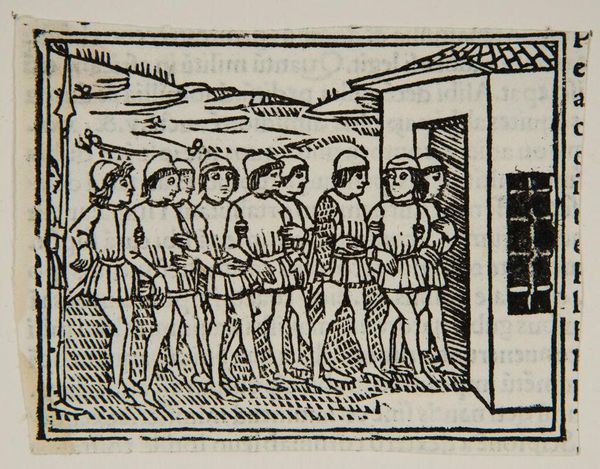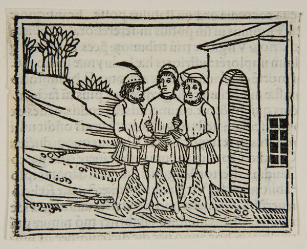 Curator: I’m immediately struck by the tension in this image; there’s a sense of unease despite the relatively simple composition. Editor: Indeed. This woodcut print, titled "Book II.27. Disssention between patritians and plebians; Ringleader of commons apprehended" depicts a scene of social unrest. Curator: The three figures, presumably the "Ringleader," appear to be in consultation, heads bowed. The artist uses the hats as markers of their status, connecting them visually. Editor: Absolutely, the attire signals a collective identity in opposition to the architecture behind them, signifying institutions of power. I find myself wondering how such images shaped public perception. Curator: The weight of visual symbols can't be overstated—they reinforce cultural narratives. Editor: Right, and in this case, that narrative involves power, class, and the ever-present potential for dissent. It's a timely reflection, still. Curator: A reminder that visual language is a potent tool for understanding society. Editor: And that even anonymous artworks have important stories to tell.