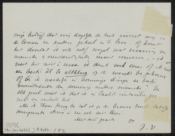 This letter to Jan Veth was written in 1918 in Amsterdam by Alphons Diepenbrock. It's written in a cursive hand, full of loops and elegant flourishes that almost obscure the text itself. The marks are confident but not rushed, giving the impression of someone who knows their mind, but is still willing to let the thoughts flow onto the page. There is a real physicality to the pressure of the pen here, each word a delicate dance. See the way the tails of the 'g's and 'j's loop down, grounding the words. Thinking about this in relation to Diepenbrock's musical compositions, which are elaborate and layered, I can see some similarities in the density of the marks and the way the artist builds up the forms, allowing space for interpretation. I'm reminded of the work of Cy Twombly in this, even though the scale is obviously very different. It's interesting to think of the letter as a drawing, an intimate and personal space where thoughts and feelings can take shape. It’s a reminder that art is often a conversation, a call and response across time and between people.