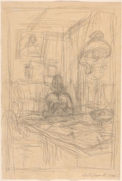 Alberto Giacometti sketched "In the Cafe" with charcoal, capturing a fleeting moment of Parisian social life. Giacometti's world was one of shifting identities shaped by the aftermath of World War I and II, as well as the rise of existentialist philosophy. The drawing encapsulates the experience of alienation and isolation. The figure, seemingly alone despite being surrounded by the trappings of a social setting, reflects existentialist themes of individual existence in a world without inherent meaning. The lines are erratic and unsure. The face is gaunt and angular, and seems to almost disappear into the background, overwhelmed by the chaotic lines. What you feel looking at this drawing? Does it reflect your own feelings of belonging? Giacometti invites us to confront the discomfort of being, and the struggle to connect meaningfully with others.