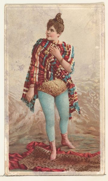 This chromolithograph, produced around the turn of the century by W. Duke, Sons & Co., presents an actress in a moment of poised artifice. Notice how the composition is divided into distinct textural zones. From the soft, feathered boa and muff, to the stark contrast with her bare legs and the almost desolate winter scene suggested by the backdrop. The actress’s pose, with legs crossed and a slight contrapposto, introduces a dynamic tension, further heightened by the color palette. The cool blues and whites of the background and costume set against the warmth of her skin and the fur. The semiotic interplay here is fascinating. The fur boa, a symbol of luxury and artifice, is juxtaposed with the implied natural setting, creating a tension between the constructed world of the stage and the raw reality of nature. This card, intended as a promotional item, hints at the constructed image of celebrity and the theatricality inherent in both the actress’s profession and the marketing of tobacco. Ultimately, it invites a deeper consideration of the relationship between representation and reality.