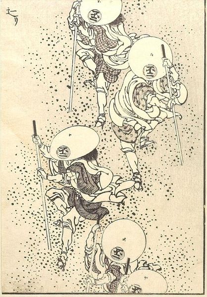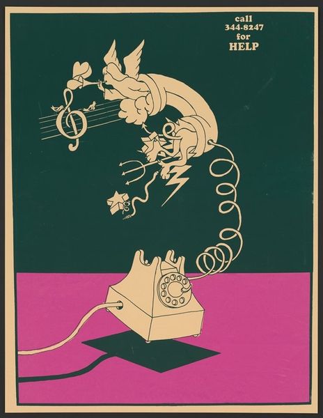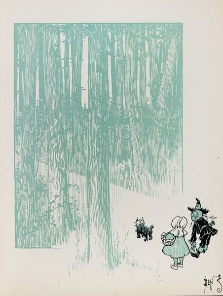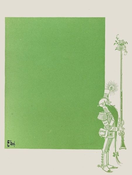 Curator: Here we have William Wallace Denslow's "The Guardian of the Gate," a drawing from 1900 rendered as a print. The flat color scheme is immediately striking. Editor: Yes, the first thing that jumps out is that intense, almost sickly green. It’s undeniably whimsical, reminiscent of illustrations in children's books. It also gives it a certain antique feel; its simplicity is part of its charm. Curator: Denslow was indeed known for his illustrations, particularly his work in the first edition of "The Wonderful Wizard of Oz". He brings a cartoonish and caricature-like aesthetic, drawing deeply from symbolist themes. The gatekeeper is rather eccentric and cartoon-like, carrying a flag with a key. Above him on a background are 4 symbols resembling suns. Editor: Symbolism for Denslow was clearly about making the imagery readily digestible for mass consumption. It’s almost as if he anticipated the need for immediate legibility in a world saturated with images. The figure with his absurd outfit certainly has a comic appeal. The way he used print here makes this image appear reproduced but in a positive sense: its availability of the images is a feature. Curator: Notice also the motif of shining circular lights emanating around the image. The shining quality certainly ties the work together visually, almost binding its different elements together into a unified expression. In many respects, there's also a slightly subversive aspect, given his involvement in advertising and commercial art during that period. The visual syntax suggests not just fantasy but something connected to everyday, mass culture. Editor: And doesn't this piece exemplify how illustrations, through printing, entered into a public life quite distinctly from painting or sculpture. We often view this type of imagery as merely support for a text, when in fact it also actively creates cultural connections with an image's readership. Denslow was acutely aware of how art could enter everyday life through popular books, postcards and newspapers. Curator: The gatekeeper becomes, in that sense, not merely a character but an embodiment of the image culture taking root at the turn of the century. It’s the perfect mix of commerce and creativity, and fantasy and the social imaginary. Editor: Absolutely, and in viewing this piece, we glimpse a formative moment where art sought, self-consciously and perhaps playfully, to reflect and engage the popular psyche.