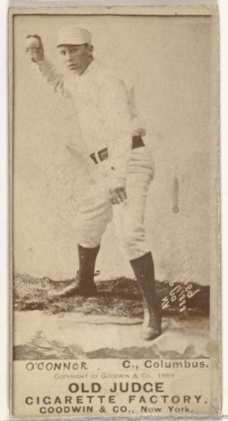 Editor: This is a baseball card from 1888, featuring William A. "Bill" Fagan, a pitcher for the Kansas City Cowboys. It's an albumen print, originally produced as part of a series for Old Judge Cigarettes. It feels very…stiff. What do you see in it? Curator: What immediately strikes me is how this small, mass-produced object speaks to the very heart of late 19th-century American identity. The idealized portrait of the athlete, a burgeoning national hero, is intertwined with the symbolic weight of tobacco and commerce. Think about what baseball represented then—a symbol of unity and national pride following the Civil War. How does this square with its association with a commercial product? Editor: That's interesting! I hadn’t thought about the link between baseball and national identity in that way. So, the cigarette brand leverages that symbolism to promote its product? Curator: Precisely. And Fagan, as the archetypal pitcher, embodies strength and precision – virtues projected onto the nation itself. The very act of collecting these cards creates a community, reinforcing those shared values. Look at his stance, his carefully controlled grip on the ball, all meant to project control, isn’t it? It also suggests what men are “supposed to be." Editor: It's also interesting to think about how these images created a cultural memory of these players. Even if people didn't see him play, they would recognize his image, thus securing a specific imagery related to an era. Curator: Exactly. Through mass reproduction and circulation, Fagan and others became almost mythic figures, shaping our understanding of what it meant to be an American athlete – an idol constructed and perpetuated by commerce. A lot to unpack. Editor: I'll definitely look at these cards differently now, understanding that cultural load that these old images carry is a lot richer than just collecting things.
