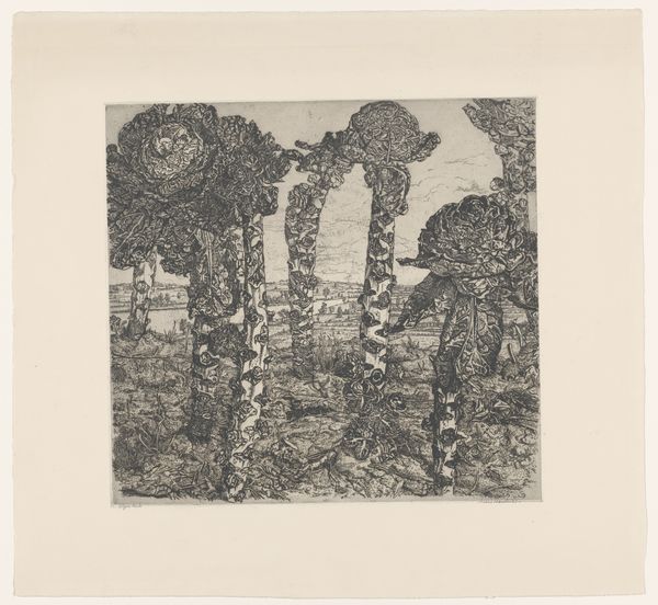 Kees Stoop made this print, titled 'Zonnebloemen', using etching, a printmaking technique dating back to the Middle Ages. The image is created by biting lines into a metal plate with acid, then inking and pressing the plate onto paper. The fine, intricate lines you see are the result of this process. The appeal of etching lies in its ability to capture detail and texture, as evidenced by the delicate rendering of the sunflowers. The dense composition and attention to minute detail suggest a deep engagement with the subject matter. The labour-intensive process, requiring skilled craftsmanship, contrasts with the mass-produced images we often see today. Considering the time and effort involved in creating this print, we can appreciate the artist's dedication to their craft and their ability to transform common materials into a work of art. This challenges the traditional hierarchy between fine art and craft, highlighting the value of skilled making.