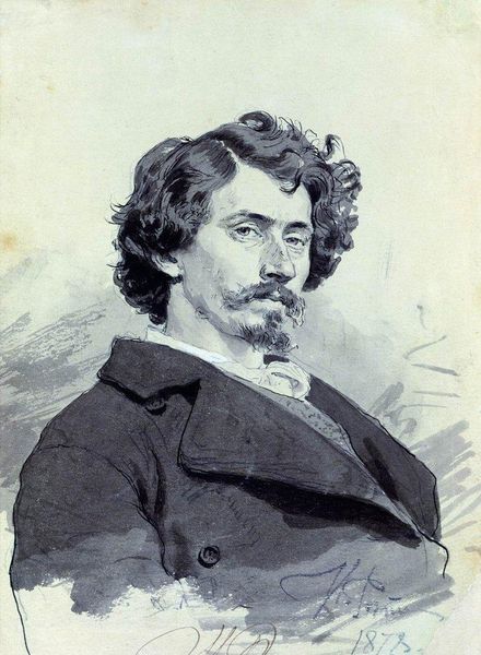 Curator: Ilya Repin's 1887 self-portrait presents a direct and perhaps even challenging gaze to the viewer. Editor: There’s a certain reserve in his expression, even a hint of melancholy. What I find striking is the looseness of the brushwork, the way the forms seem to emerge from this matrix of subtle color shifts. It's almost as if he’s painting not just what he sees, but also the act of seeing itself. Curator: Exactly. Consider that the artist's own identity is very closely connected with that Russian idea of seeing things, of confronting truths, of reflecting. It is interesting to read this against the cultural backdrop. In late 19th century Russia, self-portraits often conveyed an artist’s positioning within intellectual and political debates, and the bushy beard he wears so proudly here, a near trademark sign of Russian male identity at the time. Editor: His choice of clothing also reads into this context. That simple jacket, the slightly disheveled appearance - he's not presenting himself as some detached artistic genius but more as a man engaged in the everyday realities of life, ready to get to work. I find it incredibly accessible given his mastery of the medium. Curator: Yes, accessible yet enigmatic, but that is because his features hint at inner intellectual and artistic conflict. And his dark suit isn’t necessarily plain; it also offers a nod to his support of realist values, as opposed to ostentatious and flashy academic finery, which at that moment was almost its own sign. In other words, through the self-portrait, he affirms what it is that he believes. Editor: It really is masterfully painted, from the rendering of his face to the way the background fades into a kind of indeterminate space. It reinforces how painting, more than simple representation, is very much about materiality and its own constructed reality. Curator: It's an insight into Repin’s construction of his artistic persona, how he chose to portray himself, embedded with codes reflecting the artistic and intellectual climate of his era. Editor: Absolutely, and looking at how loose those brushstrokes are gives us insight into how those images or signs can shift and alter even without full definition. Thanks for untangling a piece of him in this artistic identity!