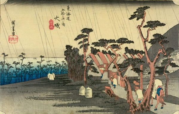 Curator: This is Keisai Eisen's "Itahana, Station 15" from his series "Sixty-Nine Stations of the Kisokaido," currently held at the Harvard Art Museums. Editor: The immediate feel is frigid. The stark white snow weighs down the trees, even as the figures trudge onward. What a testament to the working class. Curator: Indeed. Eisen’s prints, particularly this series, document the Kisokaido, a vital postal route. It highlights the infrastructures that supported Edo period commerce and governance. Editor: The woodblock technique adds a distinct layer of labor to the scene. Imagine the carving and printing involved in capturing such detail, making this art accessible beyond elite circles. Curator: Precisely. And these prints were a commodity themselves, reflecting the growing commercial culture of the time. They were not just art, but documentation of social mobility through travel. Editor: Seeing the weariness etched into the landscape itself, created by these processes, offers a stark view on the means by which goods and people moved in the Edo period. Curator: Right, Eisen masterfully used the woodblock print to represent both the beauty and the underlying labor of a vital infrastructure. Editor: A beautiful meeting of process and setting, offering so much on social movement and making at that time.