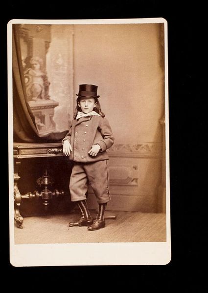 Curator: This is A.J. Rapozo's "Costumes of Michaelenses, Azores, Portugal," a small mounted photograph depicting two men in what are likely their traditional garments. Editor: It's a rather stark image, isn't it? The limited tonal range focuses my attention immediately on the textures of their clothing and the tools they carry. Curator: Indeed. Note the older man's pitchfork – it's a clear symbol of agricultural labor, but it also hints at a deeper connection to the land and perhaps even a certain rustic pride. Editor: The composition also directs our gaze. The diagonal lines of the pitchfork and the younger man's pose create a dynamic tension, balanced by the static verticality of their bodies. Curator: The photograph appears to capture a specific cultural identity; the hats, the jackets, the very stance of these men seem freighted with cultural memory. They’re presenting themselves, but also a history. Editor: Precisely. And the photographer’s use of light and shadow reinforces that sense of formality, creating an almost theatrical presentation of labor and lineage. Curator: It's a fascinating intersection of portraiture and cultural document. Editor: An intriguing study, indeed, of form, texture, and meaning in a humble photographic object.
