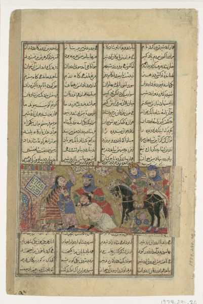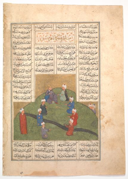 Editor: This is an illuminated manuscript page from the Khamsa (Quintet) of Nizami of Ganja, dating back to the 15th century. It’s watercolor and ink on paper, currently residing at the Metropolitan Museum of Art. It’s fascinating to me how they packed so much detail into such a small space. What stands out to you in this piece? Curator: I'm immediately drawn to the materials used, the paper, the inks, and the pigments, and their origin. Were these materials locally sourced, or did they come from distant lands through trade routes? This speaks volumes about the economy and material culture of the time. And look closely at the lapis lazuli used in the blue pigment. That wouldn't be found just anywhere. Who were the artisans crafting the paints themselves and preparing the vellum? What social class were they from? The level of patronage that enabled this project is telling, isn't it? Editor: Definitely. I hadn't considered the socioeconomic aspects so deeply. It is quite impressive to know it’s such high value pigment, it seems so precious. So you're less focused on the narrative, but rather the social elements embedded within production? Curator: Precisely. Even the gold leaf, often used in such manuscripts. Its application isn't just aesthetic. It's a statement about the patron's wealth and power and its production through mining practices tells so much of what the political economy of that time was, doesn’t it? Also, note how the figuration and landscape work. It speaks about different levels of skill and potentially several workshops cooperating to create the full illustration. We need to consider that process. Editor: So much to consider! Thanks for reframing my understanding of this manuscript; it’s about more than just illustration. Curator: Exactly, thinking about materials is not apart from, but central to cultural output and the meaning we might glean from this page.