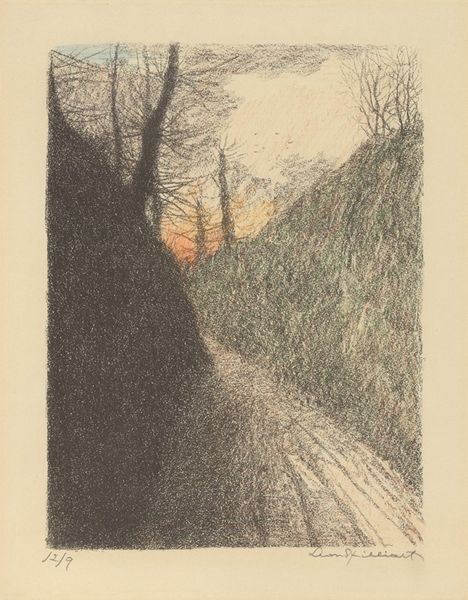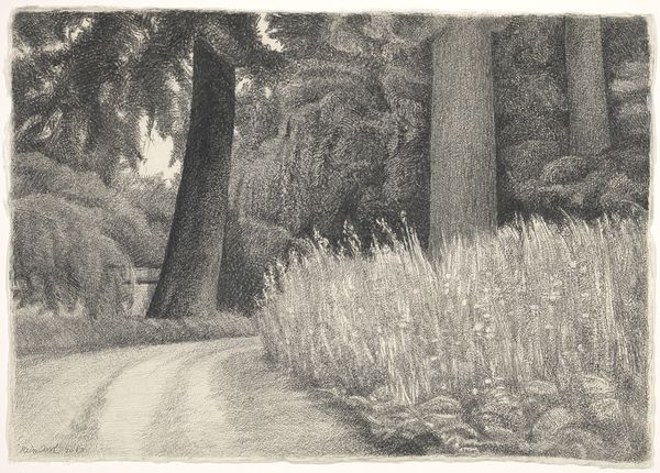 Editor: This is Theodor Kittelsen’s “Woodpecker,” created in 1900. It looks like it's made with pencil and the colors feel muted, creating a very tranquil, almost melancholic atmosphere. What do you see in this piece, focusing on the artist’s formal choices? Curator: Focusing solely on the image before us, observe the linear composition, how the road, acting as a leading line, curves through the forest. The light and shadow patterns create depth, dissecting the scene into contrasting forms. Do you see how the texture varies from the rough bark of the tree with the woodpecker to the smoother surface of the road? Editor: I see it now! It’s all about the relationships between the lines and light that gives shape and depth. So, the realistic portrayal serves more to create abstract shapes? Curator: Precisely. The bird becomes less of a representational element and more a strategic focal point within a complex interplay of form and color. Consider how the curve of the road directs the viewer’s eye. The strategic placement of the woodpecker halts that movement, holding the gaze within the artwork. It is the artist's choices that bring harmony to the piece. Editor: That’s fascinating, viewing realism in this manner. I typically focus on content. I see that even a representational work like this provides so many visual components that can be looked at separately! Curator: Indeed. Appreciating form over subject unveils layers we may have overlooked. Seeing the composition enables deeper understanding.