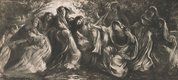 Editor: Here we have Benjamin West’s "The Three Marys," created in 1783, rendered in watercolor and charcoal. It’s such a somber piece, immediately evoking grief with the drooping figures and muted colors. What story do you see unfolding here? Curator: I see West engaging in the popular historical painting genre, but also responding to emerging social ideals. Consider the historical context: West, an American in London, achieved significant institutional power. This piece engages with the Biblical narrative of the three Marys at Christ's tomb. However, West departs from a purely religious interpretation, placing emphasis on human emotion and pathos, very much in line with the era’s emphasis on sentimentality. Editor: So it's less about divine narrative and more about… feeling? Curator: Precisely! Notice how the figures, while idealized, are presented with an accessible vulnerability. This served the purpose of the painting. The sublime backdrop underscores a grandness associated with faith and grief while the overall composition brings it down to human level. West effectively bridges religious subjects with an empathetic, public appeal, showcasing an engagement with public sentiment during his era. How might an image like this impact the masses? Editor: I see what you mean. I was initially drawn to the pure emotion, but now I'm also thinking about its role in shaping a public understanding of grief and faith. It’s fascinating how his position and time influenced the representation. Curator: Exactly. We often assume it is merely an artistic expression, but artworks like this actively participated in a complex visual dialogue that reflected the values, needs and desires of an emerging, modern society. A conversation which continues to our current moment. Editor: I had not thought of that before. Now, looking again, the piece really brings forth both personal reflection and shared experience, amplified by public values. It is way more powerful. Thank you for sharing.