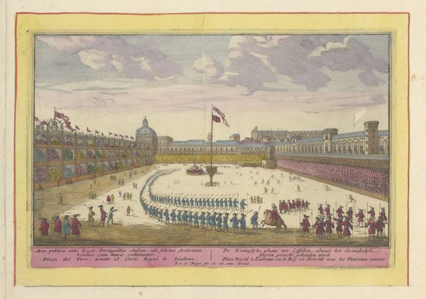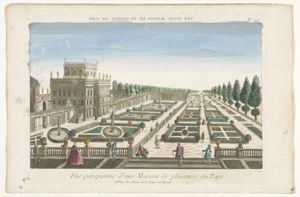 Curator: We're looking at "Gezicht op de stad Warschau aan de rivier de Wisla," or "View of the city of Warsaw on the Vistula River," a print dating from about 1759 to 1796, made with etching and watercolor, housed here at the Rijksmuseum. Editor: It strikes me as quite utopian, almost dreamlike, despite being a cityscape. The color palette is so restrained. And the people scattered across the foreground—they seem to float on the surface. Curator: The rendering of space definitely pulls from the conventions of the Baroque. The artist, Louis-Joseph Mondhare, has positioned the viewer at an elevated vantage point, allowing for a panoramic vista that speaks to the power and grandeur of the city. But it’s an interesting contradiction isn't it, offering this impression of grandeur through the material humbleness of etching. Editor: Right. And how do we interpret that flattening? Is it merely a stylistic choice or perhaps a reflection of the artist's limited access or the printmaker’s technical constraints? How much was Mondhare directly involved in production or was it outsourced? I’d be interested in investigating similar topographical prints to determine how workshop labor impacted the consistent replication and slight variance of these city views. Curator: Considering the etching medium, mass production was possible, contributing to broader accessibility of this imagery of Warsaw and perhaps solidifying the city's image both for internal and external audiences. The way the buildings almost become a backdrop allows for consideration of who is highlighted here. Wealthy figures are scattered in the foreground and stand in contrast to laborers who work along the waterway. What socio-political ideas do these deliberate distinctions project? Editor: Good point. Who controlled the waterways and therefore the trade routes is an important component to highlight here. The labor to harvest natural materials, like wood and stone, also impacted this environment. Perhaps understanding that consumption dynamic in the mid to late 18th century can connect viewers with this image through ecological study and awareness. Curator: Exactly. This image prompts me to think about how cities brand themselves—or are branded—and the power dynamics inherent in those representations. Editor: Absolutely, understanding the methods, materials, and means can lead to larger conversations about representation, impact and agency.