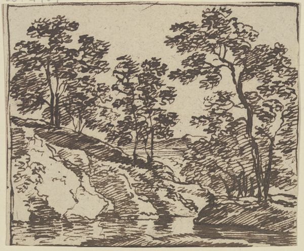 This landscape, rendered in pen and brown ink by Franz Kobell, invites us to consider how structure and composition shape our perception of nature. The eye is immediately drawn to the interplay of contrasting textures. See how delicate, almost scribbled lines define the foliage and sky, set against the more deliberate, angular strokes that give form to the rocky terrain. This tension between the organic and the geometric creates a dynamic visual field. The placement of the two wanderers introduces a narrative element, yet their small scale emphasizes the grandeur and indifference of nature. Consider the semiotic implications of the composition. The towering rocks and turbulent sky might be read as signs of the sublime, reflecting late 18th-century Romanticism and its fascination with the power of the natural world. Yet, the detailed rendering of the landscape also speaks to a desire to understand and classify nature, a hallmark of Enlightenment thinking. The detailed linear work destabilizes fixed notions of what the landscape should evoke. Kobell’s drawing functions both aesthetically and as a meditation on humanity's place within the larger order of nature.