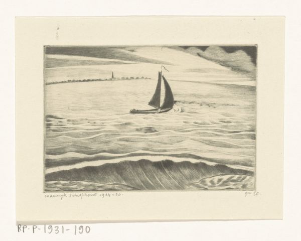 Editor: This is “Zeilschip bij Marken,” a 1924 etching by Lodewijk Schelfhout. It depicts a sailboat on a choppy sea. The limited palette really gives it a sense of somberness and drama. What do you see in this piece? Curator: The stark contrast between light and dark immediately grabs me. Note how the rippling water is created through dense networks of tiny, almost frenetic lines. The vessel seems at once afloat and engulfed by the sea's potential power. Editor: The texture is amazing, especially in the water. How does the depiction of the water contribute to its symbolism? Curator: The sea here becomes a symbol of the subconscious, of the primal, the unknown. Traditionally, the vessel can stand for the human soul, courageously sailing on the ocean of life and experience. Do you see how small and fragile the ship looks, yet it sails onward? Editor: It does seem precarious, doesn't it? It makes you wonder where it's going and what challenges lie ahead. Is this a common symbolic interpretation for maritime art of this period? Curator: The symbol of the ship at sea has existed in numerous cultural narratives. Consider "The Ship of Fools" and the ship representing humanity, without compass or skilled navigation. Schelfhout seems to draw from this well, subtly commenting on man's relationship with nature, and perhaps existence itself. Editor: I see. So it’s not just a picture of a boat; it’s layered with cultural meaning about human struggles and resilience! Curator: Exactly. The choice of etching—a medium reliant on precision and patience—further emphasizes a delicate yet persistent creation facing potentially corrosive elements. Editor: I never thought of it that way, with the etching mirroring the ship's resilience. I’ll certainly look at seascapes differently now. Curator: As will I. Each image, even seemingly simple ones, is rich with echoes of the past.