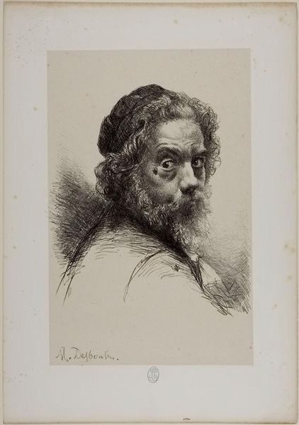 Curator: Here we have George Robert Lewis's "Head of a Man" currently residing at the Harvard Art Museums. Editor: It looks like a storm brewing in sepia tones; windswept hair, a gaze that hints at inner turmoil. Dramatic! Curator: Indeed. Observe how Lewis masterfully uses hatching and cross-hatching to construct form, creating depth and volume. The line quality varies, lending dynamism to the subject’s features. Editor: It feels like he's wrestling with something profound, or maybe just a bad hangover. The sketchiness actually emphasizes the raw emotion. Curator: Precisely. The limited palette reinforces the focus on line and form, inviting us to analyze the psychological nuances conveyed through technique alone. Editor: It's amazing how simple lines can evoke such a complex narrative. Makes you wonder what the untold story is. Curator: A stark reminder of the expressive power inherent in the fundamentals of art. Editor: I'll definitely remember this one!