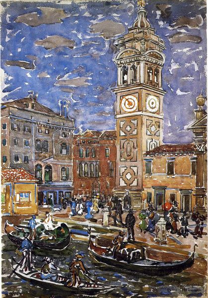 Curator: Let's take a moment to appreciate Raoul Dufy's "The Pantheon and St. Etienne-du-Mont," painted in 1904. The oil-on-canvas artwork captures a striking cityscape. Editor: Immediately, I’m drawn to the sky—that intense, almost overwhelming blue. It really dominates the scene and sets a somewhat melancholic mood. The light and shadow are used expressively. Curator: Dufy contrasts these iconic architectural forms: The Pantheon represents the grand sweep of classical aspirations while St. Etienne-du-Mont embodies a more intimate, gothic spirituality. Consider their arrangement – how Dufy aligns these sacred structures within the context of daily life. Editor: Yes, the geometry is really interesting. The painting uses very clear angular forms alongside looser brushstrokes that give the overall composition a sense of movement and liveliness, despite its monumental subject matter. I also notice how figures almost dissolve into the background. Curator: Dufy masterfully portrays the passage of time—history coexisting with modernity. The figures strolling through the square evoke a sense of continuity. Editor: Exactly. Those blurred figures reinforce that feeling. And the light—the way it falls on the buildings really emphasizes the textures and makes it appear tangible. There's a lovely sense of depth too. Curator: Think about what these landmarks might have meant to Parisians, a kind of psychological anchor. The Pantheon symbolizing collective memory, the church, faith, with the street as the stage of everyday Parisian drama. Editor: It is interesting how he merges classical and early Modernist visual vocabularies so fluidly, capturing the atmosphere rather than offering photographic precision. Curator: A very compelling aspect of the piece is indeed that tension between objective rendering and an emotional response, all those architectural anchors serve as symbolic and psychic landscapes for the contemporary observer. Editor: I appreciate the artwork much more now. The symbolism, coupled with Dufy’s application of form, transforms a familiar cityscape into a meditation on time and human existence. Curator: Yes, an unexpectedly affecting vista – where the timeless collides with the everyday.