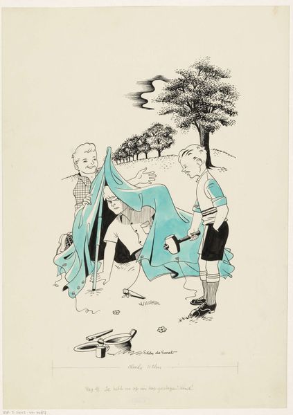 Eddy de Smet made this drawing, "Marjo met spelende kinderen op het strand", with ink and paint on paper. It feels like a memory, like the image is conjured from a hazy recollection. The simple strokes of ink create a world that's both playful and serene. The blue washes dance across the page, hinting at the beach and sea. Look at the lines creating the waves – they have an energy that pulls me in, as if I'm right there, feeling the sea breeze. There’s a calmness in the figure of Marjo, reading her book, juxtaposed against the lively chaos of the children playing. The contrast is so nice. It's like de Smet is inviting us to find beauty in the everyday, in those fleeting moments of quiet amidst the joyful noise of life. It brings to mind the work of Saul Steinberg, who had such a knack for capturing the absurd comedy of modern life with just a few strokes of ink.