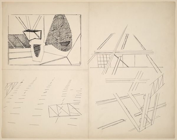 Theodore Roszak made this intriguing piece, Staten Island, with ink on paper. Roszak's mark-making feels like a process of discovery, where each line and shape contributes to a larger, somewhat mysterious narrative. I'm really drawn to the contrast between the solid black shapes and the delicate, almost hesitant lines that create texture and depth. The salmon pink of the paper peeks through, acting like a grounding element. Look at the orb-like form on the lower left side of the image; the way Roszak uses stippling to suggest volume, it reminds me of smoke or maybe even a distant planet. And then there are the geometric shapes floating in space, each with its own unique character. Roszak, like László Moholy-Nagy, seemed interested in exploring the intersection of technology and abstraction. Both artists share a fascination with the visual language of modern industry. Art is this ongoing conversation, isn't it? Full of ambiguity and wonder.