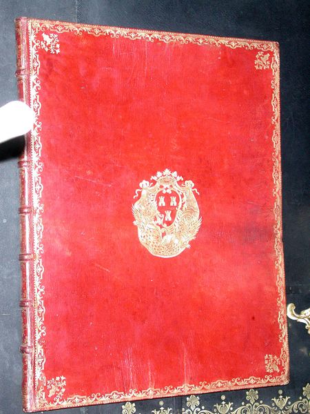 This is a tooled leather bookbinding, possibly from the 18th century, showcasing the work of Charles Nicolas Cochin II. The binding presents a rich, tactile surface where the reddish-brown leather contrasts with the gilded details. The composition is dominated by the central motif: a heraldic emblem crowned and framed by ornate foliage. The texture of the leather, subtly mottled, invites a sense of age and history. Cochin’s approach to bookbinding elevates the craft to an art form, reflecting the period’s broader interest in ornamentation and symbolic representation. Here, the cover transforms into a canvas, imbuing the object with meaning beyond its function. The gilded emblem, a semiotic system of signs, speaks to status and cultural values. The careful arrangement of these visual elements invites the reader to consider the relationship between the book's contents and its exterior presentation, suggesting that the binding is not merely protective but also interpretive. This is a cultural artifact, inviting ongoing interpretation and appreciation.