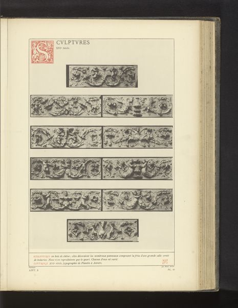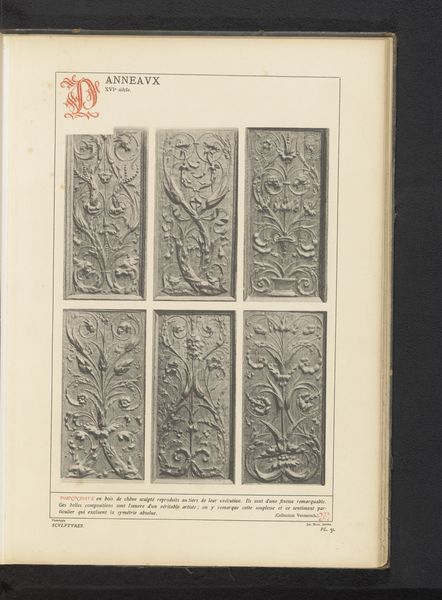 Curator: The object before us is entitled "Eikenhouten gedecoreerde kast," or "Decorated Oak Cabinet," dating from before 1889. The medium includes carving, engraving, and relief work on wood. Editor: It has a sort of grim elegance. The uniformity of the grid imposes a strict order, yet each panel teems with detailed carvings, creating a beautiful contrast. Curator: Indeed. If we delve deeper into its composition, we see how each of the panels contains unique arrangements of motifs within geometric frameworks. Notice the varying degrees of relief. Editor: Thinking about the craft—the number of hours spent by the artisan to create this intricate piece… I wonder about the conditions of production, their workshop environment, their access to quality tools? Curator: Precisely. Considering its "medieval" and "decorative art" categorization, could this be a modern reproduction intended for an aristocratic class looking to signal old world taste? Editor: Perhaps. Although, I see some imperfections, slight variations in the cutting. Maybe these tell a more compelling story. The hand of the maker becomes visible; this piece moves beyond mere decoration and provides something more human. Curator: I agree to a certain extent. The repeated shapes offer formal coherence and internal consistency, allowing the eye to move comfortably across the design while consistently rewarded. Editor: In essence, regardless of intention, the piece highlights the act of its creation and what labor went into its manufacturing and design, thus prompting us to reflect on our consumerist role. Curator: On close viewing, these carvings do reveal a depth of skill. Overall, "Eikenhouten gedecoreerde kast" reveals a dialogue between mass appeal and individuality, decorative beauty and symbolic value. Editor: Thank you. This print inspires reflection on craftsmanship and class relations in the decorative arts!