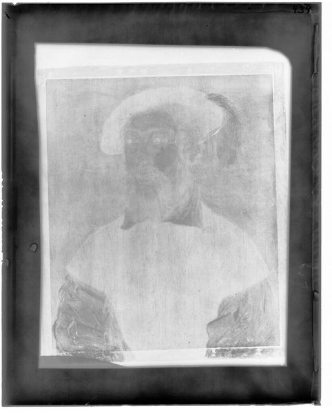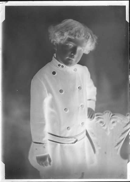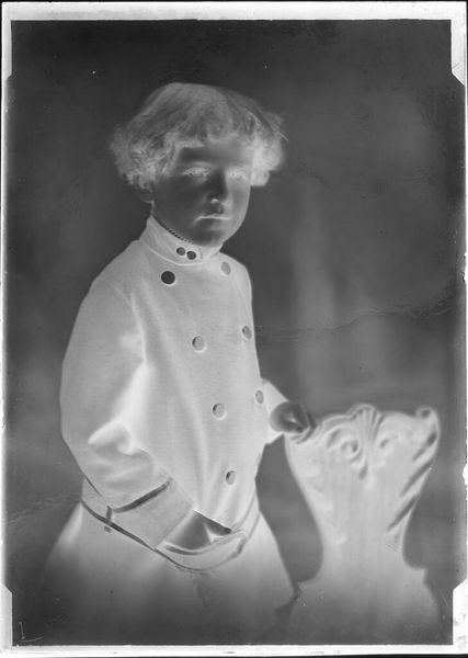 Curator: Looking at this photographic negative by John Deusing, “Untitled (portrait of a man)", the first thing that strikes me is its spectral quality. Editor: Absolutely. The man’s almost glowing figure against the dark backdrop gives him an ethereal presence. The hat he’s holding seems almost like an offering. Curator: The hat indeed symbolizes a kind of formality, perhaps his social standing. Deusing must have been a commercial photographer catering to a certain clientele. The immaculate suit and confident stance suggest prosperity, maybe upward mobility. Editor: And it's almost a symbol of power too. He holds it casually, like he has complete control. But it could also represent the weight of societal expectations. Curator: It's fascinating how an image like this makes us consider the subject's place within the social fabric of the time. Editor: Precisely. A seemingly simple portrait, yet it holds a whole world of potential meanings.