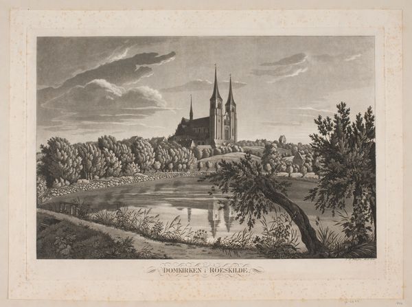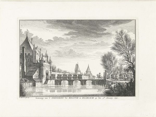 Curator: This etching, entitled "Gezicht op Slot Zuylen," presents a view of Zuylen Castle, likely created between 1760 and 1800. Editor: The immediate impression is one of calm serenity. The meticulous rendering invites contemplation. What I find intriguing is how the artist emphasizes linear forms: the strong vertical of the castle itself contrasts with the curves of the bridge and foliage. Curator: Indeed. Notice how the anonymous artist has achieved depth through careful manipulation of line weight. The building itself functions as an iconic keep of Dutch history. Its situation within the image certainly informs our reading of this idyllic setting. Editor: The castle as icon is compelling here. The castle is positioned as not just a physical structure, but as a symbol of authority, and perhaps of refuge, considering its long history. What’s remarkable is how these symbols interact, creating a subtle commentary on power and social structures. Curator: Observe, too, how the artist uses negative space, particularly in the sky, to balance the density of detail in the foreground. It allows the architecture to breathe and avoids overwhelming the composition with texture. Editor: And there's a symbolic loading to water present within landscape art: rebirth, fluidity, life-giving... but also potential peril. And of course the vessel is no simple boat; consider Charon ferrying souls. There is an intricate dialogue between nature and civilization at play in the scene. Curator: Such symbolic readings enhance our perception, highlighting the dynamic relationship between architecture and its environment. Through its compositional structure and thematic layering, the etching reflects larger concepts such as dominion, continuity, and the transience of human endeavors when juxtaposed with nature's unwavering strength. Editor: I agree. It demonstrates the depth inherent in landscape art, where the image extends beyond visual portrayal to convey symbolic and societal significance. Curator: The structural composition directs your gaze from the sharp geometry of architecture, onward to these quieter contemplative details. Editor: By combining form and allegory, it leaves one considering their place in relation to structures of power and nature's ceaseless forces.