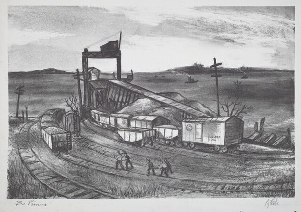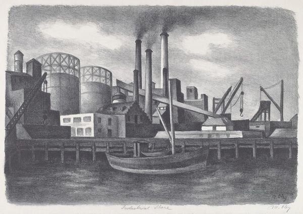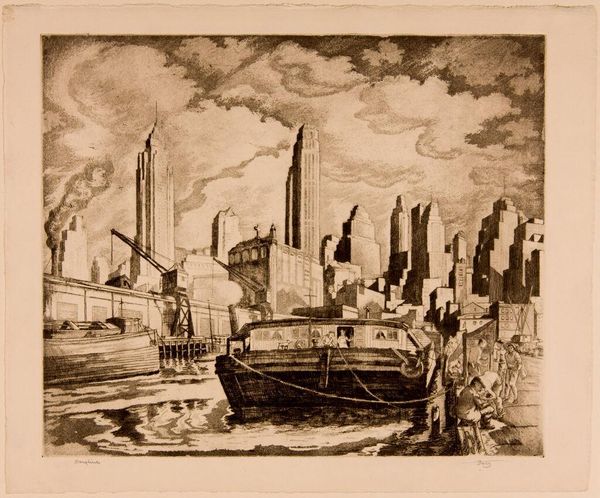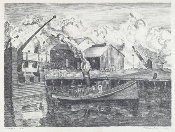 Editor: This is Albert Herrman Decker's "Hudson River," created in 1946 using pencil and graphite. It seems to portray a bustling cityscape. How do you interpret this work, focusing on its formal aspects? Curator: The composition is striking, especially the stark contrast between the linear precision of the structures and the hazy sky achieved with varied densities of graphite. Note how Decker uses line and shading to define form, particularly in rendering the textures of the vessels. Editor: So, the pencil strokes are defining elements in the artwork. The textures do create an almost tangible feeling. Is there more we can gather from this formal approach? Curator: Indeed. Observe the repetition of rectangular shapes – the buildings, the boat details – this creates a sense of rigid order, somewhat softened by the more fluid rendition of the clouds. How does the arrangement of these shapes lead your eye through the image? Editor: My eye is definitely drawn to the boat first, because of the intricate detailing, and then up into the smokestack against the cloudy sky. It's almost like a semiotic statement—industrial life reaching to the sky. Curator: A fitting observation! It highlights the interplay between industrial activity and the natural environment. Furthermore, how does the tonal range influence your perception of depth and space within the drawing? Editor: Now that you mention it, the darker areas in the foreground ground the image and lead to lighter tones, giving depth. This attention to visual space emphasizes a very clear perspective. I learned so much about visual language through your eyes. Curator: The essence of art lies within its elements, waiting to be decoded. It has been enriching discussing this work with you and tracing how formal structure expresses its nature.