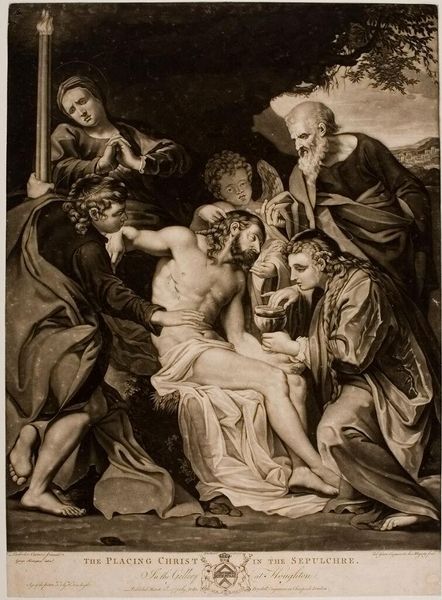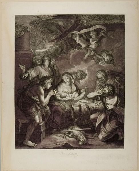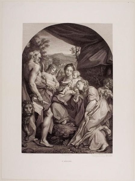 Editor: Let's talk about Francesco Bartolozzi’s “Saint Jerome," currently at the Harvard Art Museums. It looks like an etching or engraving. The scene feels so intimate, with the figures clustered together. What stands out to you about this work? Curator: It's the dreaminess, isn't it? Bartolozzi captures a tenderness, almost a private moment. The soft lines, the way the light seems to embrace the figures...it feels less like a formal depiction and more like a glimpse into a sacred, loving family scene. Notice how Jerome, often depicted as a solitary scholar, is surrounded by cherubs, a lion, and the Virgin Mary and child. What a lovely, imaginative reinterpretation! Editor: It is different than how I've seen Saint Jerome depicted, that's for sure. Thanks for pointing that out! Curator: My pleasure. It's these unexpected touches that make art so endlessly fascinating, don't you think?