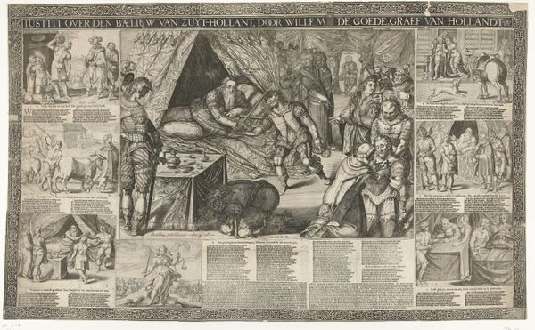 Curator: Today we are looking at a baroque engraving, "The Solemn Entry of Philip V of Spain into Naples, May 20, 1702." The artist, though currently anonymous, captured this momentous occasion with etching and engraving techniques. Editor: My immediate impression is one of grand spectacle, meticulously rendered in monochromatic detail. The composition seems almost overloaded with information, yet the eye is somehow drawn to the figure of the king on horseback. Curator: Absolutely, and considering the political context is key here. Philip V's ascension was contested, part of the War of the Spanish Succession. This 'solemn entry' was a powerful statement of legitimacy, a visual assertion of his rule in Naples. Editor: Structurally, the use of perspective is quite interesting. The foreground figures are large and detailed, while the cityscape recedes into a hazy background, creating a sense of depth and emphasizing the scale of the procession. Curator: And look at the framing! Small scenes are inset below the main action, portraying victories perhaps? Consider how these inserts support the narrative, reminding viewers of Philip’s supposed military and political dominance at the time, despite his highly contested claims. Editor: The materiality of the print itself is also notable. The fine lines of the etching create a rich texture, while the deeper cuts of the engraving add contrast and definition. It's a testament to the skill of the printmaker. Curator: Indeed. The print served as propaganda but also disseminated a certain idea of leadership that reinforced rigid class structures in the Bourbon empire. How do we situate artwork within the long history of coloniality? Editor: Ultimately, it's the dynamic interplay between form and content that makes this work so compelling. The Baroque aesthetic perfectly serves the political purpose. Curator: Reflecting on it, the artwork functions as an idealized image intended to solidify Philip V's power amid turmoil, revealing much about political performances and representation. Editor: I leave with a deeper appreciation for how such skillful engraving reveals layers of social commentary and visual strategy.