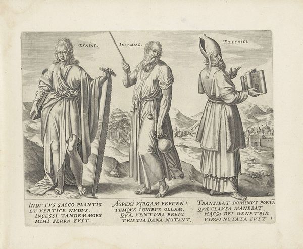 Editor: Here we have “Stamvaders Aser en Naftali,” a print made sometime between 1585 and 1643 by Johann Sadeler I. It's a detailed engraving depicting two biblical figures, each in their own panel. The stark black and white and the detailed line work give it a formal feeling. What stands out to you about this piece? Curator: I immediately look to the materiality of this print. The very act of reproducing images through engraving democratized access to art and ideas. We should ask ourselves about the socio-economic implications of printmaking at the time, how this mode of production would alter and reify concepts like originality and authorship. The act of creating multiples meant that ideas circulated more broadly, changing how people engaged with narratives. The figuration is important but only insomuch as we understand how these images impacted their contemporary audience. What labor was involved? Who was consuming them? Editor: So you're focusing less on the religious aspect of the figures and more on the social impact of the print itself? The dissemination of these figures more than the figures themselves? Curator: Precisely! Look at the level of detail achievable through engraving, a technique requiring significant skill and time. Who were these artisans, and what were their relationships to the patrons commissioning this work? Further, consider the context in which these prints were viewed: Were they collected, displayed, or used for educational purposes? Understanding the labor, the audience, and the context of consumption is key to unpacking the true significance of this piece. How might owning such an engraving shape one's identity or understanding of history? Editor: That gives me a completely new way to appreciate it. I usually get caught up in trying to decode the symbols. Thinking about it as a commodity that had a specific cultural function really opens it up. Curator: Indeed. It allows us to move beyond the image and consider the broader social and economic forces at play during its creation and circulation. The artist’s work reflects and also reinforces specific societal expectations, class divisions, religious dictates.