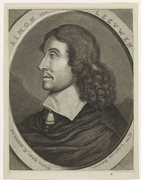 Curator: Pieter Philippe produced this engraving, "Portret van Simon van Leeuwen," in 1662. It's currently held at the Rijksmuseum. Editor: Immediately, I’m struck by its precision. The lines are incredibly fine, creating a delicate, almost ethereal feel despite being a portrait of what seems to be an important person. Curator: Absolutely. Philippe’s skill in capturing detail is evident, especially in the rendering of van Leeuwen’s hair. Notice how each strand seems meticulously placed. From an art historical point of view, portraits like these functioned as powerful status symbols within 17th century Dutch society. Van Leeuwen, whose name is etched above his head, was obviously someone of prominence. Editor: Yes, there's a formality in his profile and the weight implied by his clothes and title. This elevation creates a barrier between us and the sitter; a deliberate effect? Are we meant to be impressed, and how are those classical flourishes underneath relevant? Curator: Those classical references printed at the bottom provide vital clues. By presenting Van Leeuwen in this timeless idiom, Philippe suggests qualities such as erudition and enduring significance. And it all adheres very strictly to conventions of Baroque portraiture. We see the restrained, idealised, authoritative sitter made very permanent. Editor: I see what you mean about this formality lending him a historical dimension. Does this portrait reveal something specific about its sitter’s personality, or does it project period values onto his form? This makes me question how engravings can genuinely capture the spirit of an individual beyond established codes and iconography. Curator: A crucial point. One could certainly argue the extent of genuine representation in such formal portraits. But through analyzing its technical mastery and how it fits within societal and artistic conventions of its time, we find avenues to decode the subject and age's values. Editor: The work then reminds me that the subject and its maker live through time, though both inevitably fade. How interpretations transform history: not as fact, but through images and artistic representations, to reveal even more about both of their eras than at first seen.
