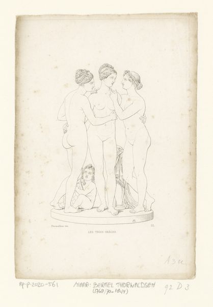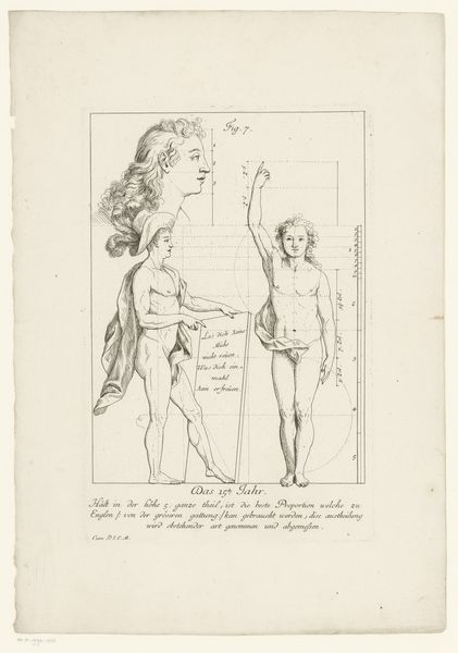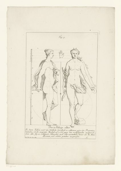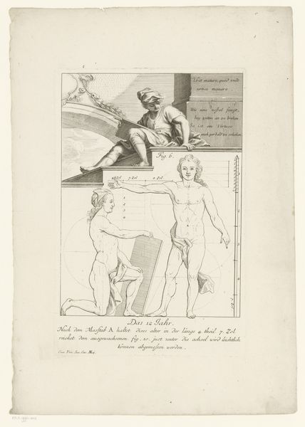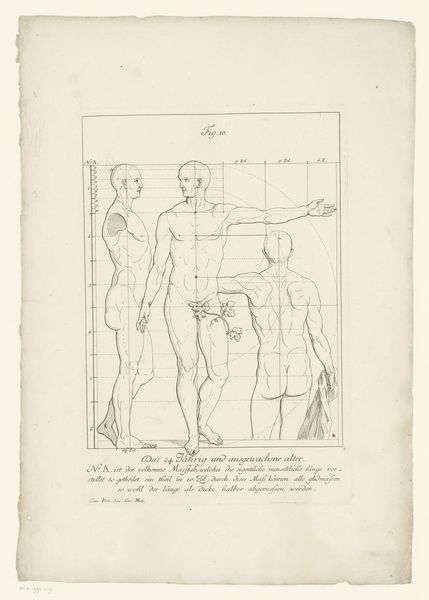 Curator: Before us, we have an intriguing drawing entitled "Three Views of the Body of a Nine-Year-Old Boy," created by Hieronymus Sperling in 1723. It's currently housed here at the Rijksmuseum. Editor: It's stark, almost clinical. The figures, rendered in precise ink lines on paper, remind me of architectural blueprints or a scientific illustration. It looks like it’s designed to convey factual data about proportion, rather than an emotive observation of a person. Curator: Indeed. Sperling seems to have created this as an academic study. In its time, these drawings played a crucial role in the education of artists, serving as models of ideal human form. Editor: Note how the repetitive representation denies the individuality of the boy; there are no observable characteristics or distinguishing features other than ideal proportions and geometries of the human form. The labor and detail needed for this—the multiple views, the calibration and mathematical references—highlight how bodies became commodities for artistic consumption and scholarly pursuits, effectively stripping them of agency. Curator: I think you bring up a fascinating and deeply challenging point regarding agency. Yet it's important to consider this work in its socio-historical context, as nude studies were typical, especially during academic training for young artists in the Baroque period. This piece probably represents both the idealization of the human form, aligned with classical ideals, and potentially, a certain kind of scientific objectification that rose with The Enlightenment and associated belief in objectivity. Editor: Even that pursuit of the “objective” speaks to material reality! Artists don't work in a vacuum. Sperling needed ink, paper, studio space—these drawings were part of the network of production in his time. Even the choice of model has ramifications of class and power that the final piece presents with neutrality, which demands scrutiny. Curator: That’s a wonderful reading of this piece. Ultimately, this work serves as a complex document revealing intertwined ideals regarding science, form, and perhaps even class during the early 18th century. Editor: Agreed. Sperling’s engraving certainly provides ample context for pondering how images both reflect and construct realities—both physically and socially.