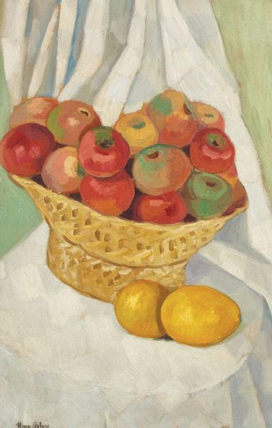 Curator: Before us we have Stefan Dimitrescu’s painting, "Still Life with Ripe Fruits", an oil painting rendered in a distinct realism style. Editor: Immediately, I'm struck by the earthy, almost brooding, quality. Despite the bright colours of the fruit, the overall impression is one of shadow and ripeness, verging on decay. It feels incredibly grounded and sensory. Curator: Interesting. Looking at the history of still life as a genre, one must consider its association with displaying bourgeois affluence, or its memento mori allusions. Fruit arrangements became opportunities to flaunt both social standing and reflect mortality. Does this composition say something more about this artist's perception of reality? Editor: Absolutely. I think the composition invites us to consider access and plenty, especially when juxtaposed with Dimitrescu’s historical and social context. In a time of political strife and shifting social paradigms, I view this as an articulation of both opulence and potential instability. How lasting can this abundance be, considering its ephemeral nature? Curator: Considering the period, that’s astute. Let’s consider Dimitrescu’s use of thick, almost hasty, brushstrokes. I imagine the canvas would have an unusually tactile surface. He seemingly prioritizes texture over a smooth, idealized finish. Does the choice of materials enhance any narrative or dialogue about social topics? Editor: Most definitely. I believe Dimitrescu consciously rejects this idealized form by imbuing it with an urgency that’s unmissable, through materiality. These fruits, resting upon what may be viewed as a slightly tattered tablecloth, present both wealth and vulnerability. The very fleetingness and fragility, it becomes a powerful allegory for a changing era, an urgent reminder of both the beauty and precariousness of life. Curator: It makes me appreciate the artist’s visual narrative all the more. It provides insight into society at the time through art. Editor: Indeed, bringing in so many contemporary points, this gives the piece an even broader dimension.