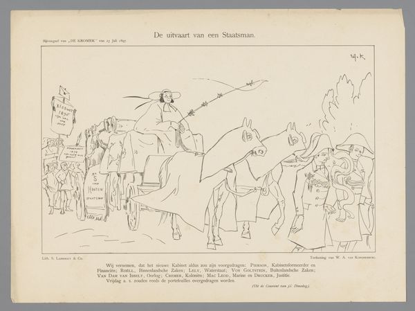 Editor: This pen and ink drawing is called "Spotprent op het programma van de antirevolutionairen tegen de schoolwet, 1865," created in 1865 by Johan Michaël Schmidt Crans. It's packed with figures and symbols and has a definite satirical feel. What jumps out at you when you look at this piece? Curator: The visual language speaks volumes about the cultural anxieties of the time. Notice how the artist employs caricature to exaggerate the features of the figures. The banner proclaims "Schoolwet- en Religiestrijd," which tells us this is about a struggle related to school laws and religion. How does this relate to your understanding of the period? Editor: Well, it suggests there was significant opposition to educational reforms happening then. But what’s with the figures dressed in historical garb, like the person blowing the horn who appears to be from the 17th century? Curator: That anachronism is crucial! By placing contemporary political figures in historical clothing, the artist is drawing a parallel. The artist wants the audience to recall the religious conflicts of the 17th century. It invites the viewer to consider whether the current debate mirrors those earlier struggles. What feeling does that juxtaposition evoke? Editor: I see – so it's not just a snapshot of a specific moment, but it's invoking this long history of tension and disagreement. That adds so much depth to what seemed like a simple caricature at first. It feels very loaded. Curator: Precisely. Images operate as cultural memory. Schmidt Crans utilizes visual tropes to elicit emotional reactions and solidify political positions. Reflect on what you observed - the impact goes beyond political commentary, highlighting how symbols create dialogues with history. Editor: This has opened my eyes to how political cartoons function! They are not just funny drawings, but powerful commentaries linking the past and present using a shared visual vocabulary.