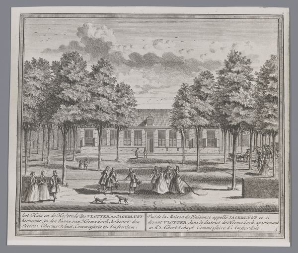 Curator: This is an engraving titled "De colonnade in de tuin van Versailles," made around 1715 by Jean Baptiste (I) Scotin. Editor: It has an incredibly formal air to it, doesn't it? Like everyone is carefully posed in this theatrical space. I imagine whispered conversations and the rustle of silks. Curator: Exactly. The Colonnade itself was designed by Jules Hardouin-Mansart within the Gardens of Versailles, as a place for lavish entertainment. Scotin's print offers a glimpse into the Sun King's courtly world. Each figure looks so small, contained. What do you make of them? Editor: I find them to be a representation of power dynamics, almost pawns. These figures seem deliberately dwarfed by the architecture. You get the feeling the engraving captures the constraints, social and political, placed upon individuals within that era. There is an interesting relationship here between the elite and the masses and between individual freedom and collective identity. Curator: I see your point! The baroque style lends itself to such grand gestures and imposing structures. Personally, I find it interesting to focus on the medium itself. This is an engraving, right? So every single line, every nuance, had to be carved precisely. What commitment to craft! Editor: It is very interesting you mention the crafting itself. Yes, it reflects the regimented world. This deliberate hand-crafting aligns so beautifully with the baroque aesthetic and highlights the controlled environments favored by the ruling class. Every element contributes to a narrative of curated power, echoing throughout time. Curator: So, while I'm marveling at the delicate dance of light and shadow, you're digging into the socio-political implications, making sure it sparks some questions for those listening in the galleries. Editor: Absolutely, it's about connecting history and aesthetics. And thinking through, and feeling through how they speak to each other in the space. And, really, in the time. Curator: Indeed.