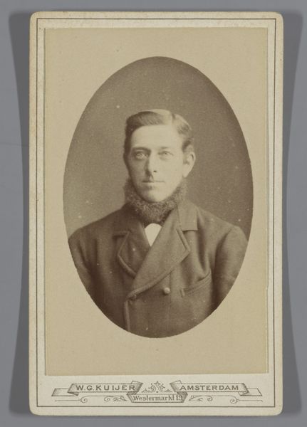 This is a photograph of an unknown man, made by Veuve J. van Koningsveld. The photograph itself is a cultural artifact, reflecting the rise of photography as a means of representation and social documentation in the 19th century. It represents a specific social class and cultural context of the time. The man's clothing and accessories, such as the suit and bow tie, indicate his social status and adherence to societal norms of dress. In a way, the image is creating meaning through visual codes, cultural references, and historical associations. The photographer, Veuve J. van Koningsveld, was a female artist working in a male-dominated field, and this challenges the traditional gender roles and power dynamics of the art world at that time. To further understand the work, we would research the social history of photography, and the economic factors that shaped the market for such images. Ultimately, the image can tell us much about the culture of its time.