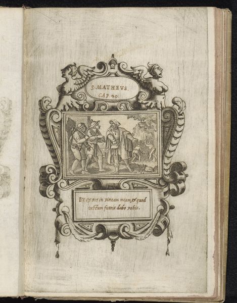 Curator: This engraving, titled "Besnijdenis," or "Circumcision," depicts a key religious scene from the Northern Renaissance, estimated to have been created between 1570 and 1631. Though we only know him as Monogrammist HSD, this piece currently resides here at the Rijksmuseum. Editor: It’s such an intimate, yet strangely public moment captured within this very elaborate frame, which feels both sacred and theatrical. The level of detail for such a small work is astonishing. Curator: Indeed, the detailed etching and engraving bring a striking sense of drama, highlighting the artist's skill. And that frame, so characteristic of the era, directs our focus while also serving as ornamentation. Consider, too, that prints like this facilitated wider access to religious narratives in an age before mass media. Editor: The composition really draws you into the scene. There's something almost voyeuristic about witnessing this sacred ritual from a distance. You have this close huddle of figures dominated by ornate objects – you almost smell the incense even though its a black and white image. The tiny text below the central scene must carry profound symbolic weight as well. Curator: Absolutely. The Latin text reinforces the image's intended message, guiding the viewer to contemplate the spiritual significance. It's a powerful convergence of image and text, typical of religious prints designed for personal devotion and theological instruction. It is as much propaganda as it is devotion. Editor: The dark lines and light spaces in the picture tell a clear story and point you right to its central topic. I'm thinking about what that narrative asks of viewers, both then and now. This isn’t just a religious illustration; it's an image intended to convert belief into devotion, action. Curator: Precisely. And it provides insights into the dissemination of religious ideas and cultural values during a transformative period in European history. A moment framed for the ages. Editor: It really sticks with you, this little window into such a formative time, a reminder that faith has always been mediated, interpreted, and presented—much like art itself.