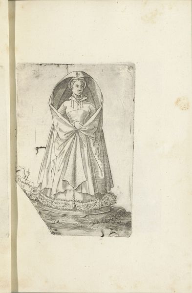 Curator: Before us is “Flandrensis,” an etching by Enea Vico, crafted before 1558. This print, currently housed in the Rijksmuseum, offers an intriguing example of Mannerist portraiture. What strikes you immediately about this composition? Editor: The overwhelming impression is one of… containment. The figure, presumably a woman, is almost swallowed by the voluminous fabric surrounding her, rendering her strangely static. There's a distinct sense of imposed constraint, wouldn't you say? Curator: Precisely! Vico masterfully employs line and form to create that effect. Notice how the smooth, curving lines of the drapery contrast with the intricate detailing of the gown beneath. It’s this visual tension that lends the piece its dynamism. Editor: It begs the question: is the containment purely sartorial or is it representative of societal expectations? The "Flandrensis" depicted—an allegorical personification of Flanders—is cocooned. Could that also represent the region’s political climate or the constraints placed on women? What narrative are we supposed to infer? Curator: I agree that reading historical context into visual imagery adds depth. Semiotically, one might suggest her carefully clasped hands symbolize constraint of selfhood in favor of propriety and tradition. And given its historical context, a history painting from this era undoubtedly offers commentary beyond the purely representational. Editor: Furthermore, consider how this image was circulated as a print, making it available to a wider audience. Its symbolism resonated politically. Flanders—an area now divided among Belgium, France, and the Netherlands—has seen waves of occupation, domination, and division. Could it symbolize Flanders’ desire to shield and protect its regional autonomy? Curator: That reading seems viable; though I hesitate to bind art too closely to overt political intentions. I’m often inclined to focus on the print’s intrinsic formal relationships: the tonal variations Vico achieves through meticulous cross-hatching, the visual balance struck between the figure and the surrounding space. Editor: True, appreciating the craftsmanship shouldn't negate historical analysis, however. By examining "Flandrensis" through intersecting lenses of social norms and visual language, we unveil an artwork ripe for critical interpretation. Curator: Well said! I appreciate your perspectives; it offers an engaging way to understand Enea Vico’s “Flandrensis” and opens up avenues to look beyond its immediate appearance. Editor: Indeed. By juxtaposing formal analysis with historical awareness, it reveals just how artworks can become active participants in dialogue about gender and power.