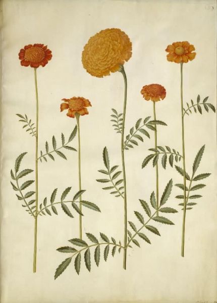 Curator: What a meticulously rendered array of colors and shapes. There's a precision here that truly appeals to the eye. Editor: It feels almost scientific, like a visual compendium of possibilities, capturing each specimen’s character, its symbolic essence. Curator: Exactly. We're looking at "Ranunculus asiaticus," painted between 1649 and 1659 by Hans Simon Holtzbecker. It's a botanical study rendered with watercolor and gouache. The piece is currently held at the Statens Museum for Kunst. What do you make of Holtzbecker's rendering? Editor: The Ranunculus, or Buttercup, here is a symbol of radiance and charm, as their captivating appearance suggests. What is compelling here, I feel, are the bulbs themselves; in many ways they could suggest potential and fragility – reminders of fleeting beauty and constant transformation. Curator: That’s perceptive. The selection of blooms he included emphasizes different stages of life—from closed buds to radiant blossoms—allowing a kind of symbolic contemplation of growth and change. What formal aspects do you feel contribute to the painting's symbolism? Editor: The artist’s controlled hand and the crisp detail in rendering veins, textures, and shadows create a compelling sense of life. And the neutral ground sets the flowers outside of any temporal or earthly context. I like how that focuses my eye. The color itself has an ethereal lightness and the details of each individual flower are exquisite. They evoke the meticulous work associated with Medieval tapestries or early books of hours. Curator: Indeed. It’s fascinating to see Holtzbecker capture the Ranunculus as a cultural artifact – almost elevating them into emblems of their own narrative. Each color tells a tale – the gentle blush of one variety, and the sunny yellow of another – their individual meanings adding to the piece’s overarching symbolic value. Editor: Well, Holtzbecker's precise touch certainly illuminates more than just the natural world; it invites a deeper meditation on the transient nature of beauty, captured in its peak moment of splendor. Curator: A lovely observation. This was such a nice close-looking session; I'm so ready for our next exploration.