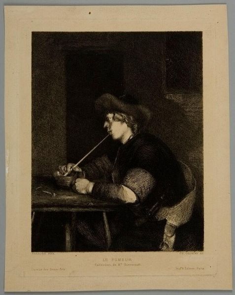 Editor: This print, "De philosophe" by Jan Pieter de Frey, shows a scholar at his desk. The etching looks very labor-intensive. I wonder about its purpose in society. What can you tell me about this piece? Curator: Consider the materials first. Etching allows for multiples. How does the accessibility of prints influence the consumption and understanding of intellectual figures during this period? Editor: So, it’s about how accessible knowledge becomes through these repeatable images? Curator: Precisely. And what labor goes into its creation, from the artist to the printer? It's not just about the "philosopher," but also about the means of production that allow us to see him. What new insights did you glean from that perspective? Editor: It's fascinating to think about the artist’s role in shaping perceptions through accessible media. Thanks for that viewpoint!