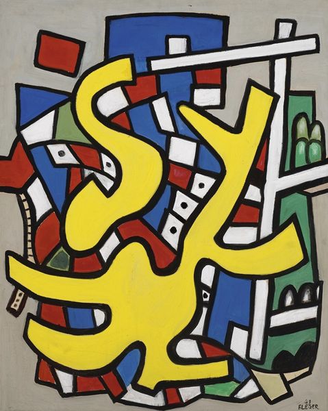 Fernand Léger made this painting of a flower vase in his studio with oil on canvas. Notice how Léger reduces everything to its simplest forms, like cylinders, squares and triangles, but still manages to capture the essence of a bustling studio space. Look at that strong blue vertical rectangle—it’s so solid and confident. It runs right through the middle, tying everything together. Then you’ve got these bold colors, red and yellow, popping up all over the place, framed by thick, black lines. Those lines don't just define shapes, they also seem to vibrate against the white background, giving the whole image a real sense of energy. See the simplified face on the left and how it mirrors the vase of flowers to the right? Léger always reminds me of Stuart Davis, another artist who loved to take everyday objects and turn them into these rhythmic, jazzy compositions. But unlike Davis, Léger has a certain machine-like quality to his work, a nod to the industrial age. It’s like he's saying, "Even the most delicate things, like flowers, can be part of this modern world."